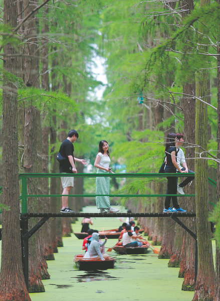 Tourists enjoy the coolness at a "forest above water" scenery spot in Luyang Lake Wetland Park in Yangzhou, Jiangsu province, in early summer. [Photo/Xinhua]
